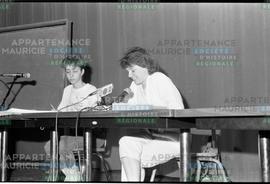 2 femmes s'adressant à un auditorium rempli. Représentants du conseil-étudiant. Les étudiants du Cégep ont approuvé de faire la grève dans une proportion de 59% pour les 521 étudiants réunis. Également, 82% des étudiants ont approuvé d'aller à Québec la semaine prochaine pour manifester contre les coupures annoncées par le gouvernement.