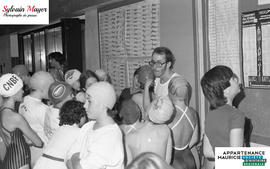 Personnes faisant de la natation, personne assise à terre faisant un Rubik's cube.