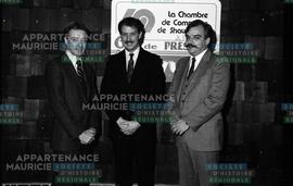 Portraits devant une affiche de la Chambre de commerce de Shawinigan lors d'une conférence de Denis Héroux de l'Alcan.