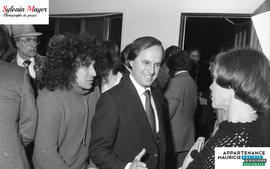 Grand rassemblement de personnes, un homme serre des mains et fait le tour des gens. Yvon Lemire Candidat Libéral dans St-Maurice, Yves Duhaime ministre des finances parti Québécois.