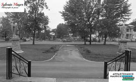 Ruines de bâtiments brûlés, statue religieuse, panneau de rue.