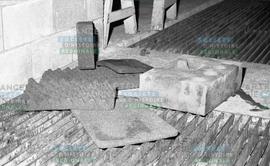 Contenu d'une boite sur le sol avec des mousses protectrices. Elle contenait du matériel de mesurage.