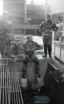 Deux plongeurs près d'une ouverture avec un autre homme. Ils sont à la recherche des pièces d'équipement volées plus tôt dans la semaine au barrage de Grand-Mère, mais les recherches n'ont rien données à ce moment.