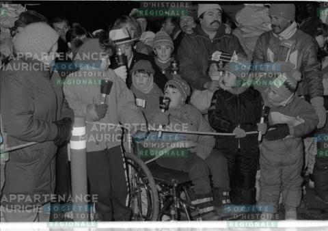 Plusieurs enfants attendent derrière une corde la flamme olympique avec de petites flammes en carton.