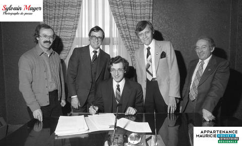 5 hommes se tiennent en groupe pour officialiser la signature d'entente de Woolworth