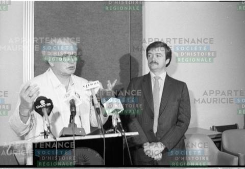 Gerrard Kelly, directeur général, présente le plan quinquennal du Cégep de Shawinigan pensé par celui-ci, Jean Gignac, directeur des services pédagogiques, Pierre Desrosiers, directeur des services administratifs, Jean-Marie Bédard, directeur des ressources humaines, Pierre Duquette, directeur des services aux étudiants et Guy Robert, consultant externe.