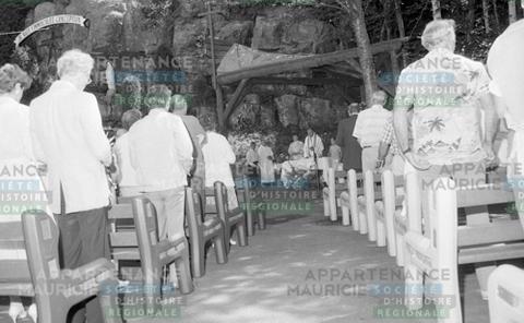 Des personnes assistent à une messe extérieure au calvaire de Saint-Élie-de-Caxton.