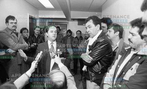 Un homme parle aux médias pendant que plusieurs personnes le regardent.