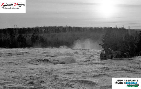Vue sur la rivière Saint-Maurice près des chutes. L'eau est agitée.
