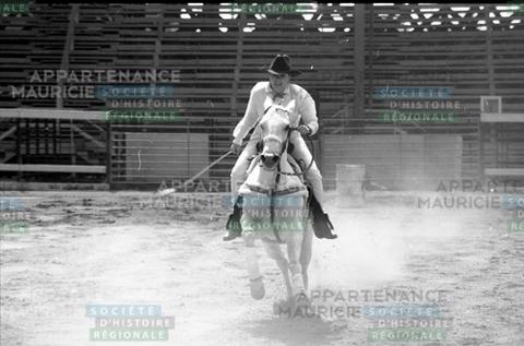 Cavalier sur un cheval dans l'arène tenant un semblant de fouet.