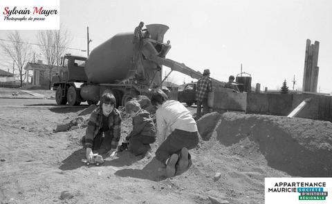 Des enfants jouent dans le sable près d'un camion-bétonnière.