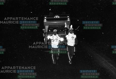 Deux personnes transportent la flamme olympique devant un véhicule récréatif.