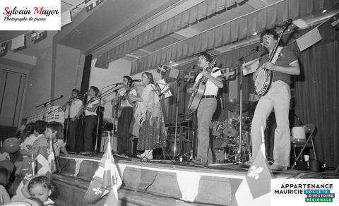 Un groupe de musique joue sur une scène. Des enfants sont assis dans les escaliers menant à la scène.