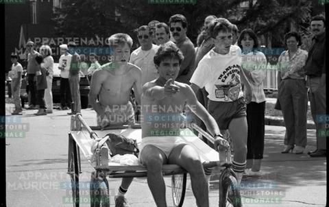 Deux hommes poussent un lit avec un autre homme dessus. Plusieurs personnes regardent la course dans le cadre des activités de la Classique de canot.