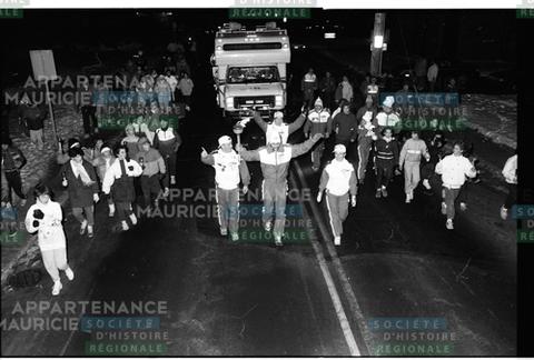 Plusieurs personnes courent devant un véhicule récréatif avec la flamme olympique.