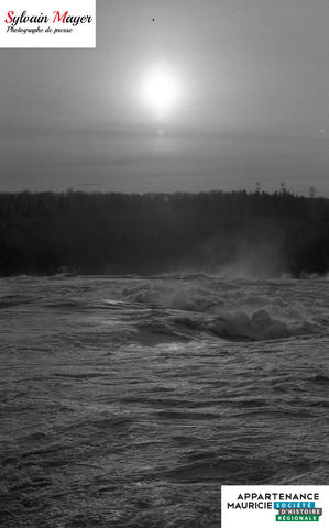 Vue sur la rivière Saint-Maurice près des chutes. L'eau est agitée.