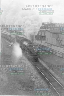 Deux hommes se tiennent devant une locomotive à la gare de Trois-Rivières