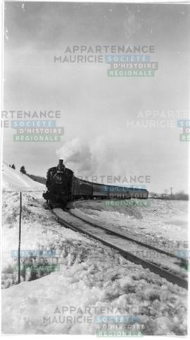 Train mené par une locomotive dégageant beaucoup de fumé, probablement à Trois-Rivières.