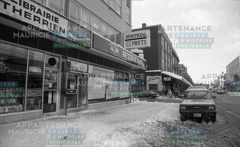 Vues extérieurs de commerces sur la 5e Rue à Shawinigan ; La Promenade Shawinigan, A&W, Librairie Therrien. Le A&W et le Harvey's se font rénover. Le Harvey's prendra place dans l'ancien local du Castel Grec et celui de la Boutique Émotions.