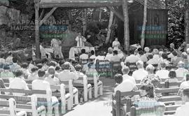 Des personnes assistent à une messe extérieure au calvaire de Saint-Élie-de-Caxton.