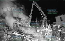 Les débris restant du bâtiment brûlé. Une pelle mécanique s'affère déjà au travail.