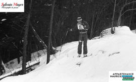 Skieurs acrobatiques en action. Personnes tenant une affiche de la coupe Sealtest.